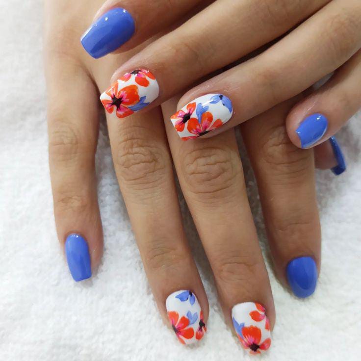 Cool blue nails are combined with white bases and bold floral prints for a breezy summer vacation feel. The look is clean yet vibrant, inspired by clear skies and coastal colors.