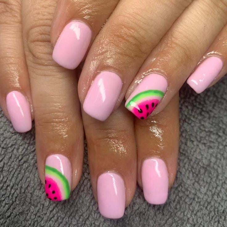 A soft blush base is paired with hot pink nails and simple watermelon accent art. The overall style is clean and minimal with a playful fruity twist, making it perfect for a subtle summer statement.