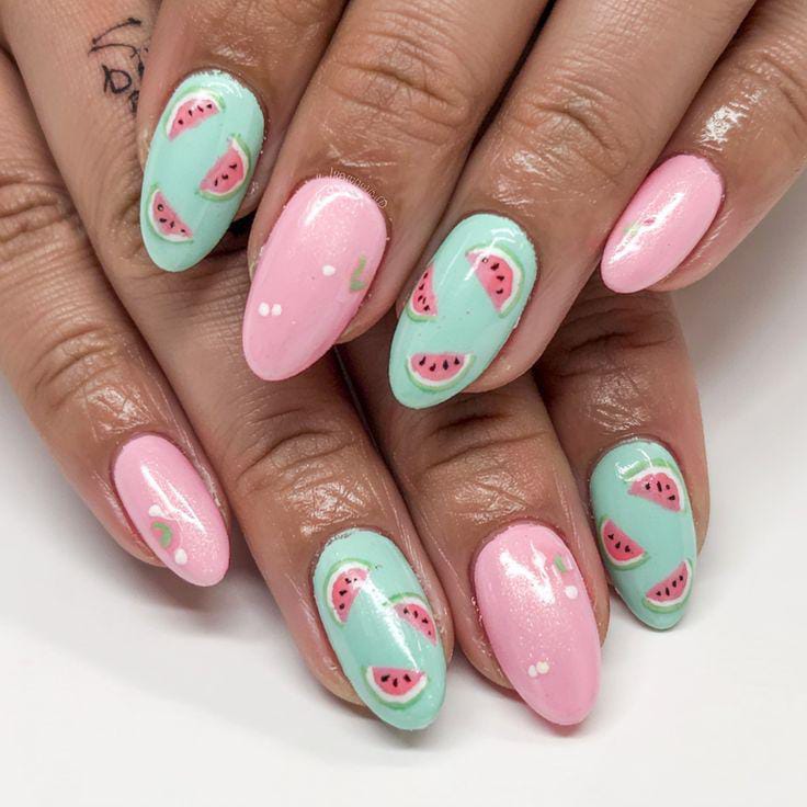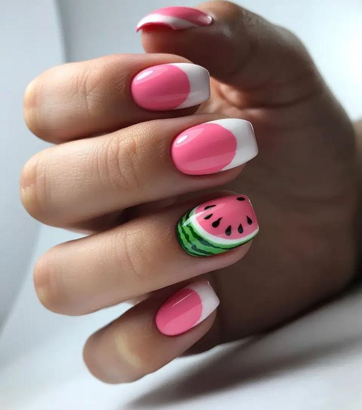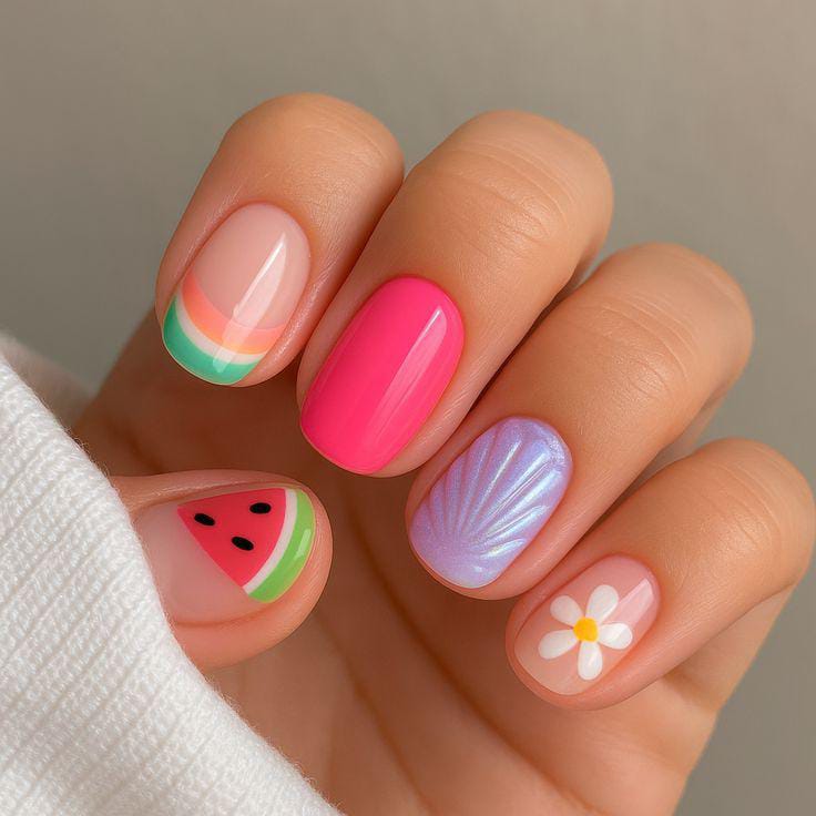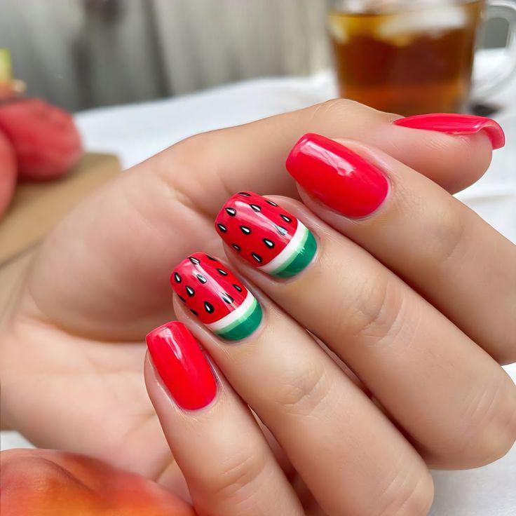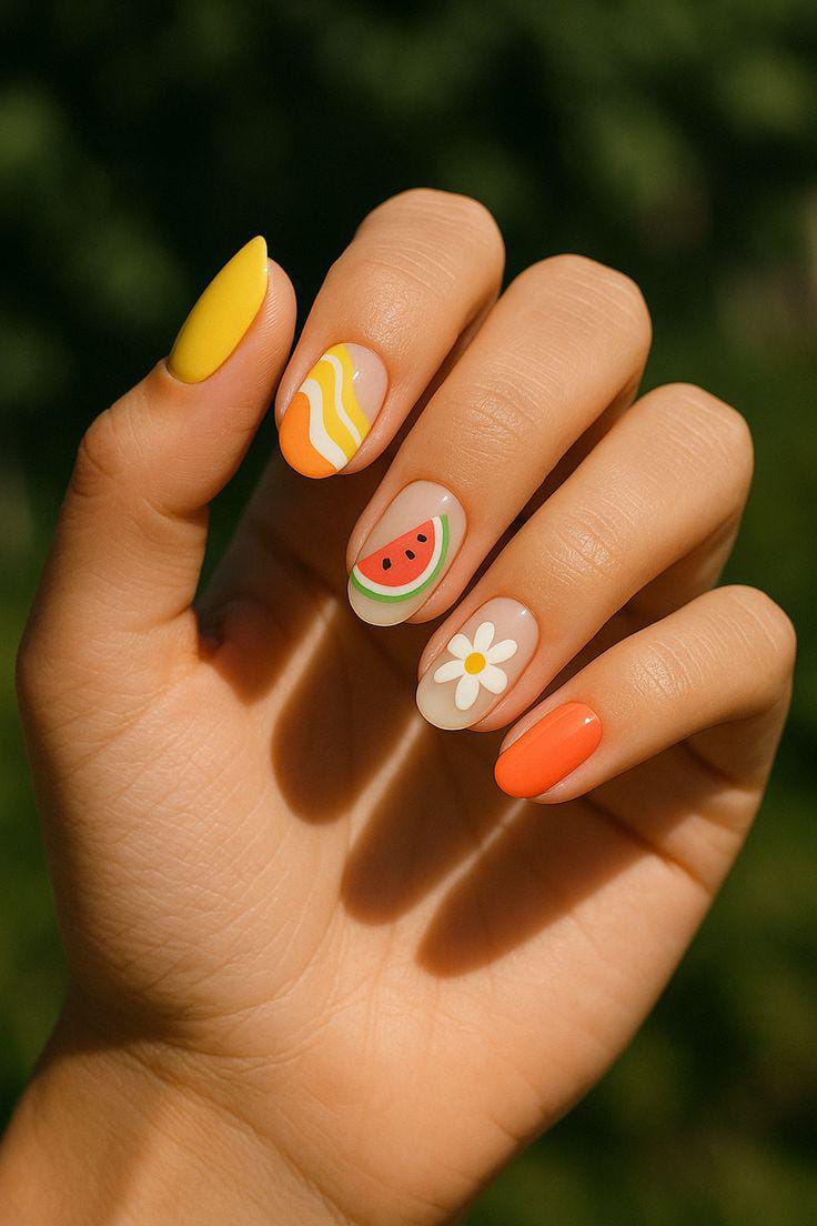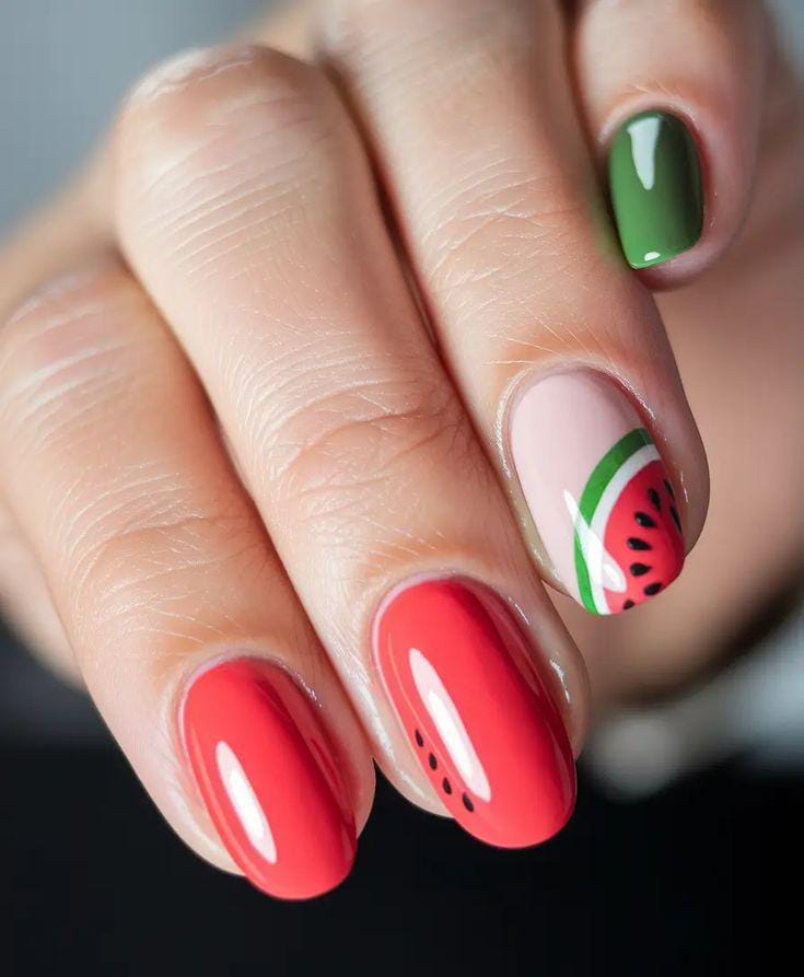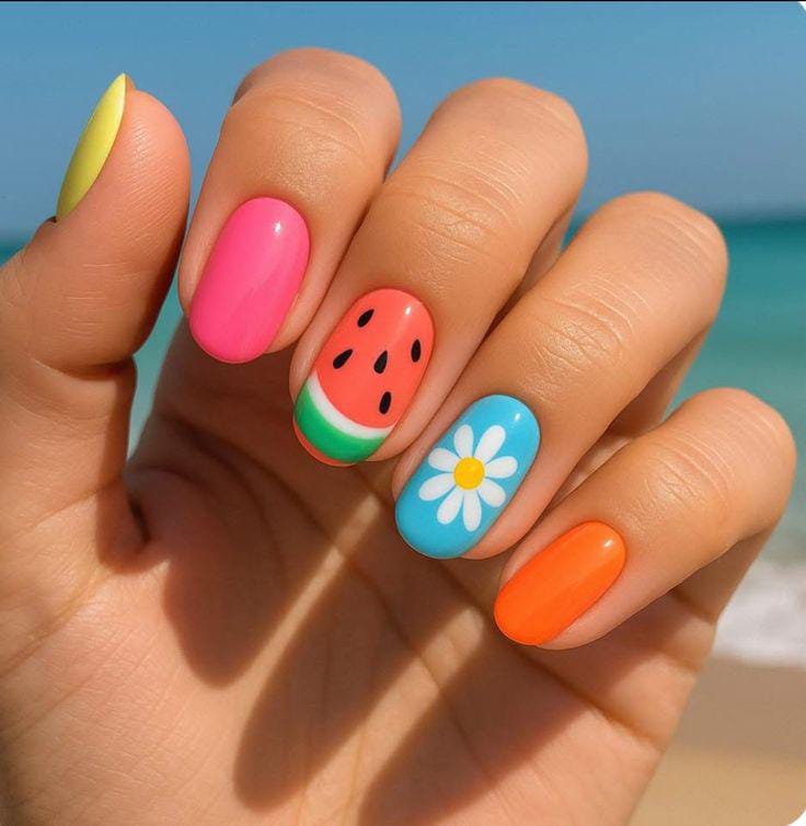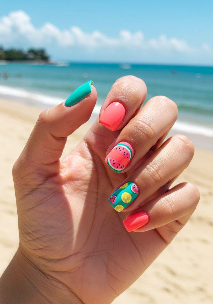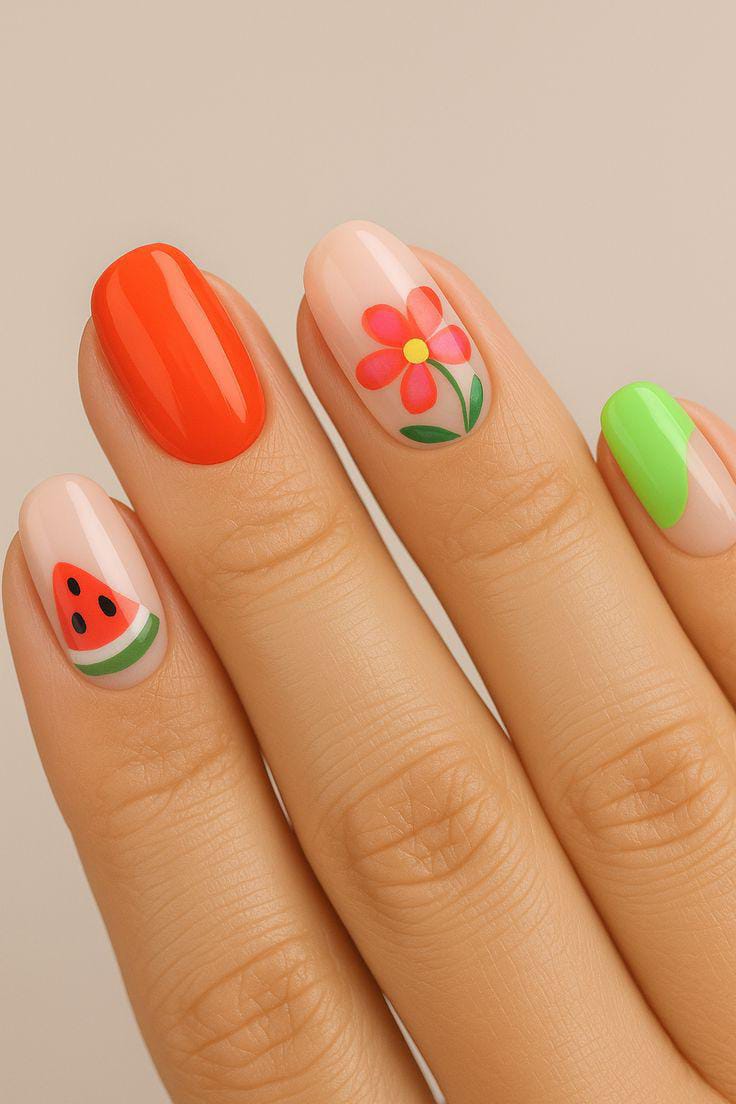 A mix of coral, nude, and soft green shades gives this look a light and airy feel. The tiny watermelon slice and floral accent add a cute, delicate summer touch. It’s fresh, minimal, and subtly playful.