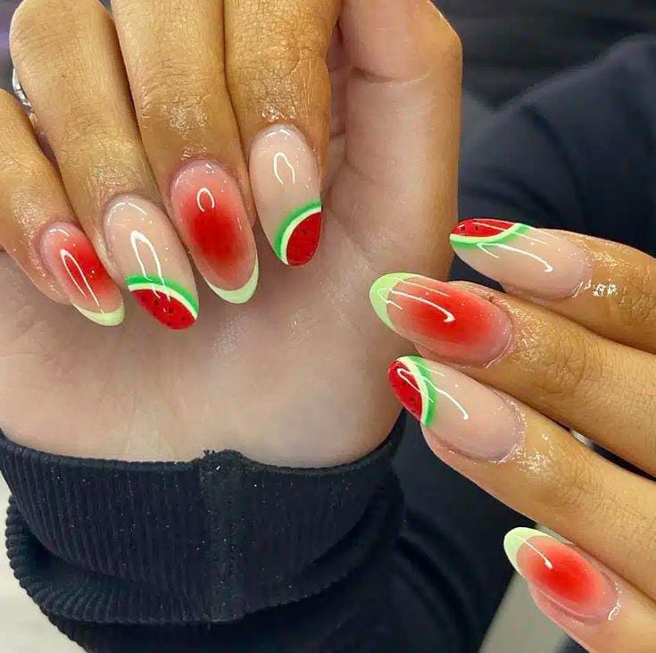 These almond-shaped nails feature a soft nude base with red ombre centers that resemble juicy watermelon flesh. Thin green French tips and subtle slice details add a fresh twist. The overall look is trendy, glossy, and full of summer energy.