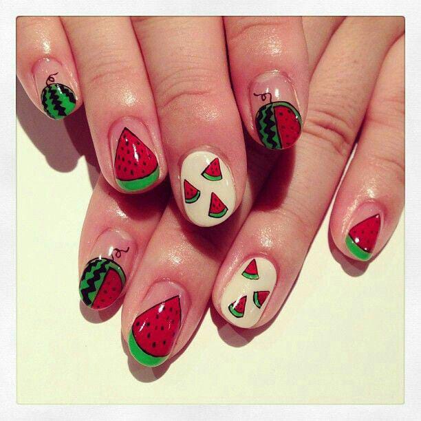 This design is packed with small watermelon slices and bold red and green details on a mix of nude and cream white bases. The playful placement and bright colors give it a youthful, cartoon-like charm. It feels fun, quirky, and full of sweet summer personality.