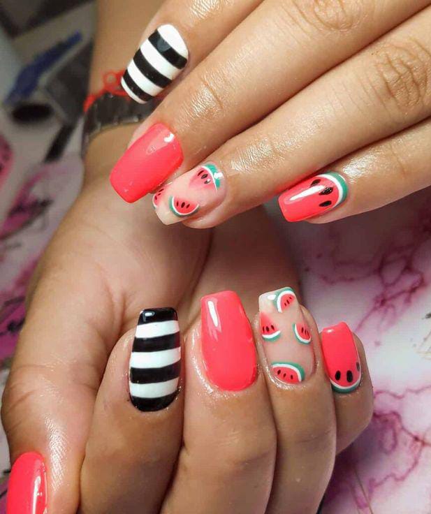 This design mixes nude and bright coral pink with playful watermelon accents for a bold summer look. The black-and-white striped nails add a graphic contrast that makes the juicy watermelon details stand out even more. It feels vibrant, fresh, and full of sunny energy.