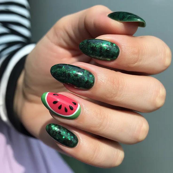 Deep shimmery green nails create a rich, almost magical base, paired with a single watermelon accent for a fun twist. The glossy finish gives it a sleek, polished vibe while still keeping that fruity summer charm. It’s bold yet balanced.