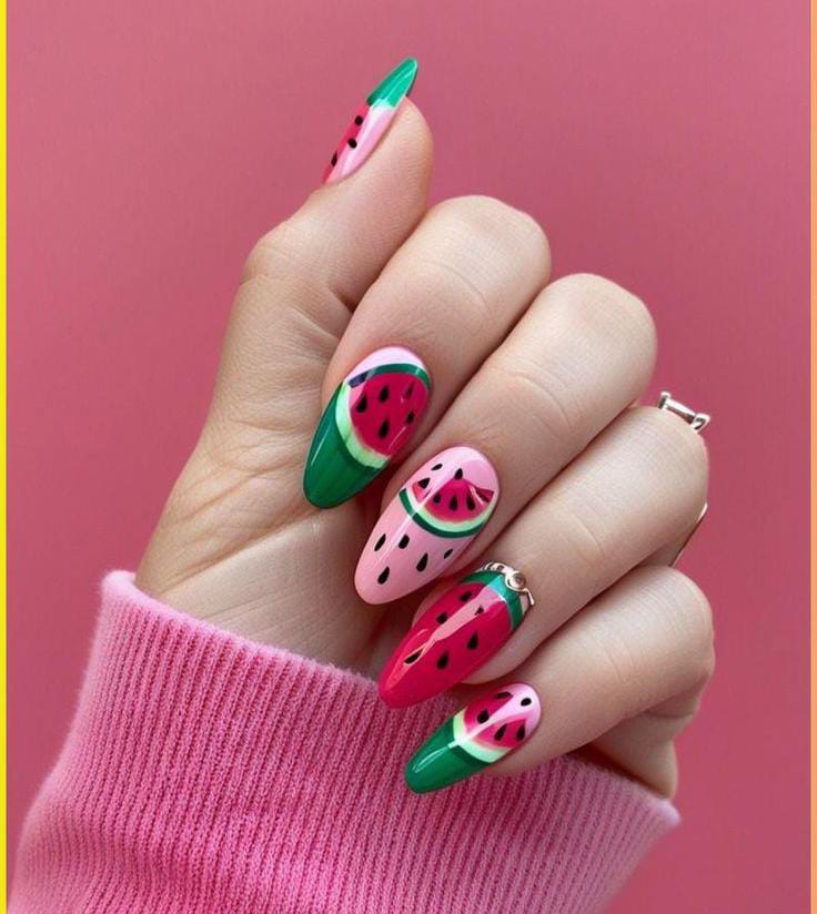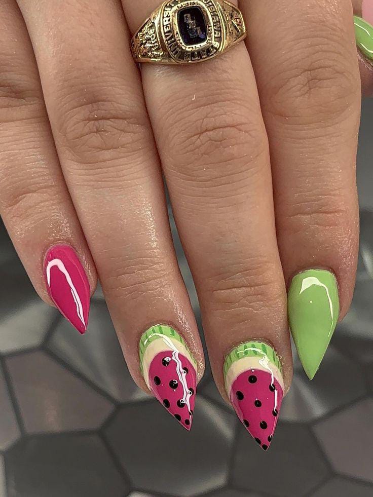 Featuring stiletto nails, this design pairs solid hot pink and green shades with detailed watermelon slice art. The sharp shape adds drama while the fruity design keeps it playful. It’s vibrant, eye-catching, and confidently summery.