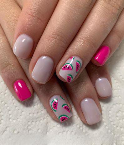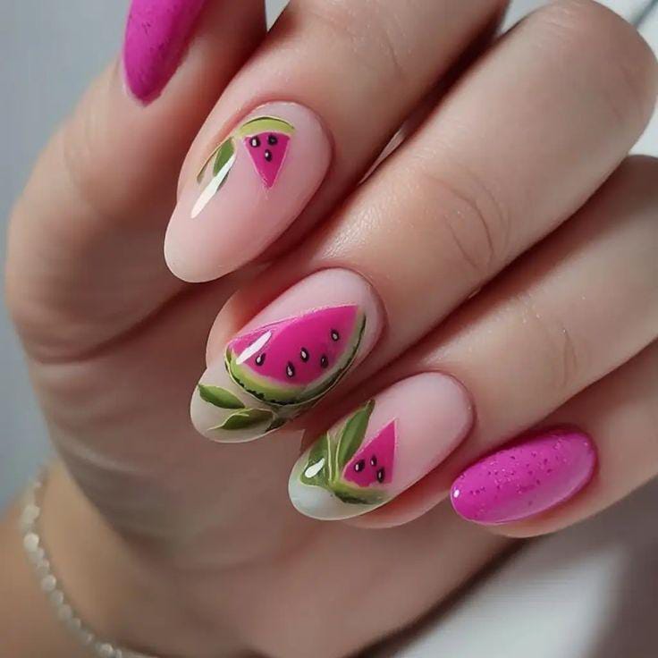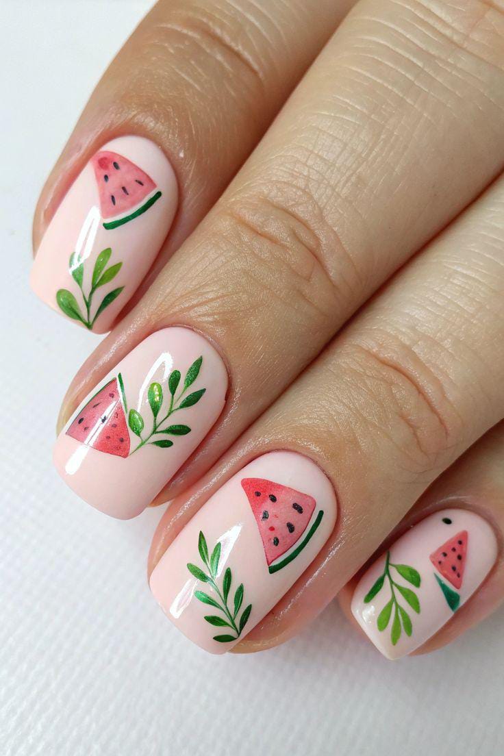 Soft blush nails are paired with bright pink watermelon slices and delicate green leaves for a cute, fruity look. Solid hot pink nails add contrast and makes the design feel bold, sweet, and fun summer.