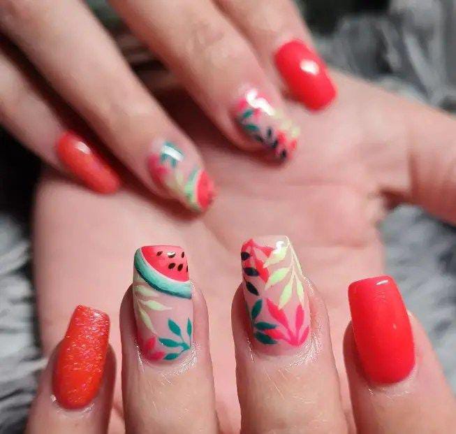 A mix of coral-red nails and nude bases with leafy details creates a tropical, fruity feel. The watermelon slice accents with the soft botanical elements for a lively summer look. It feels fun, colorful, and vacation-ready.