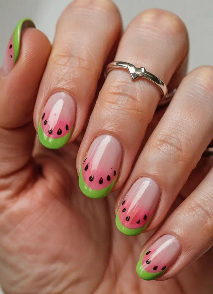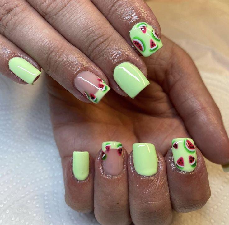 These nude nails combine a soft lime green polish with subtle watermelon tip accents. The design feels clean and slightly minimal while still keeping that juicy summer vibe. It’s fresh, light, and effortlessly cute.