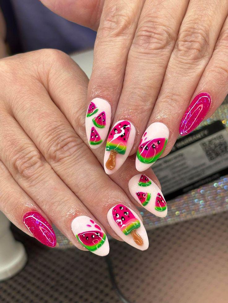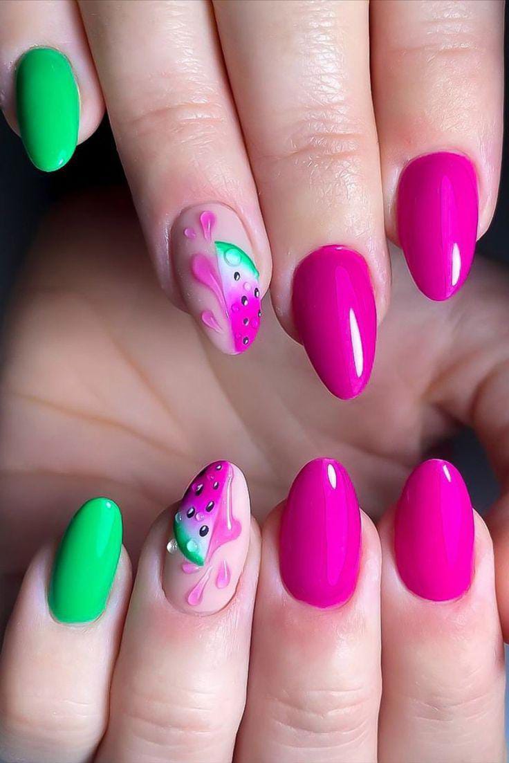 This look combines neon pink and vibrant green for a striking contrast. The dripping watermelon nude accent adds a playful, juicy effect that feels bold and trendy. It’s loud, confident, and perfect for making a statement in summer.