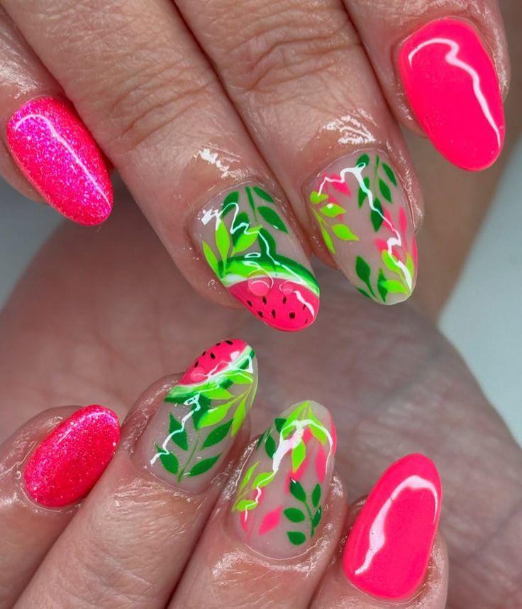 This design mixes bright hot pink and glitter pink nails with sheer translucent accent nails decorated in leafy green details and juicy watermelon slices. The overall vibe feels tropical, fresh, and playful with a glossy summer finish.