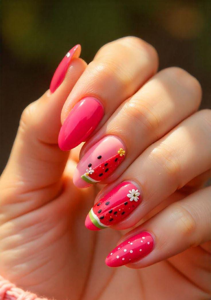 Bright pink nails are paired with detailed watermelon slice art and tiny floral dots accents. The design feels cute, sunny, and slightly playful, like a summer picnic in nail form.