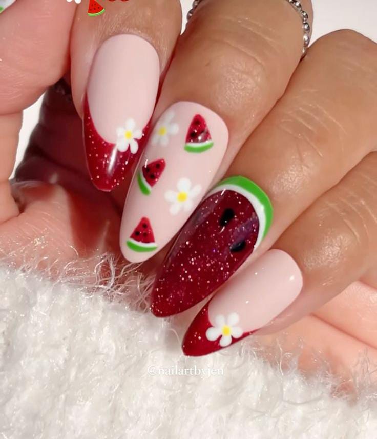 This style combines matte nude baby pink tip nails with glittery deep red accents that resemble juicy watermelon flesh. Small watermelon slices and white daisies add a cheerful, summery charm with a slightly glam touch.