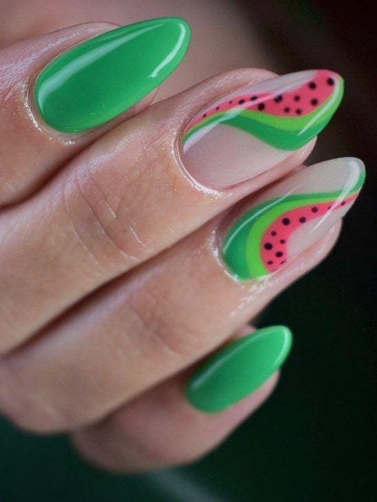 This design blends bold green polish with abstract watermelon-inspired swirls on nude bases. The curved lines and glossy finish give it a trendy, modern summer feel.