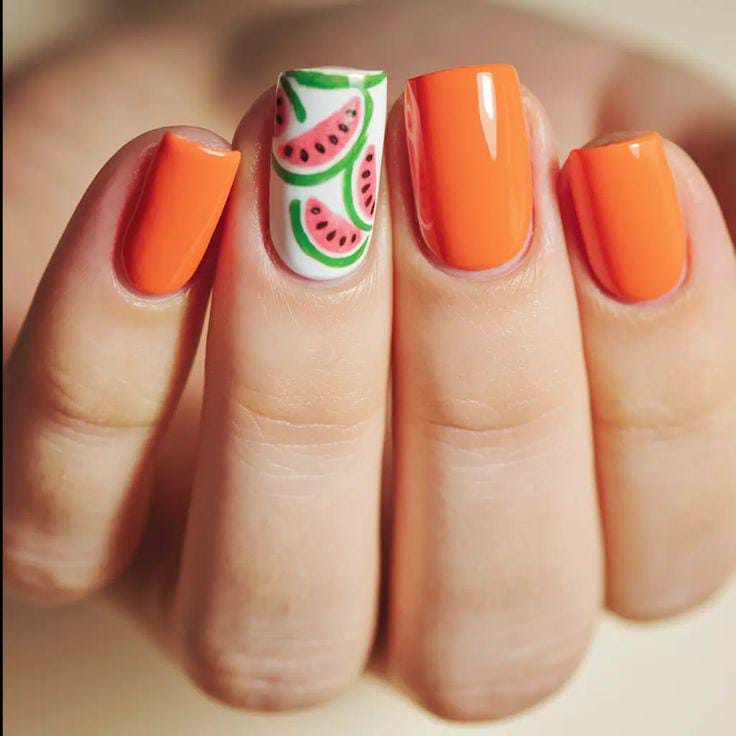 Bright orange nails are paired with a single watermelon cream accent design for a fun color contrast. The overall style feels bold, sunny, and perfect for a lively summer mood.