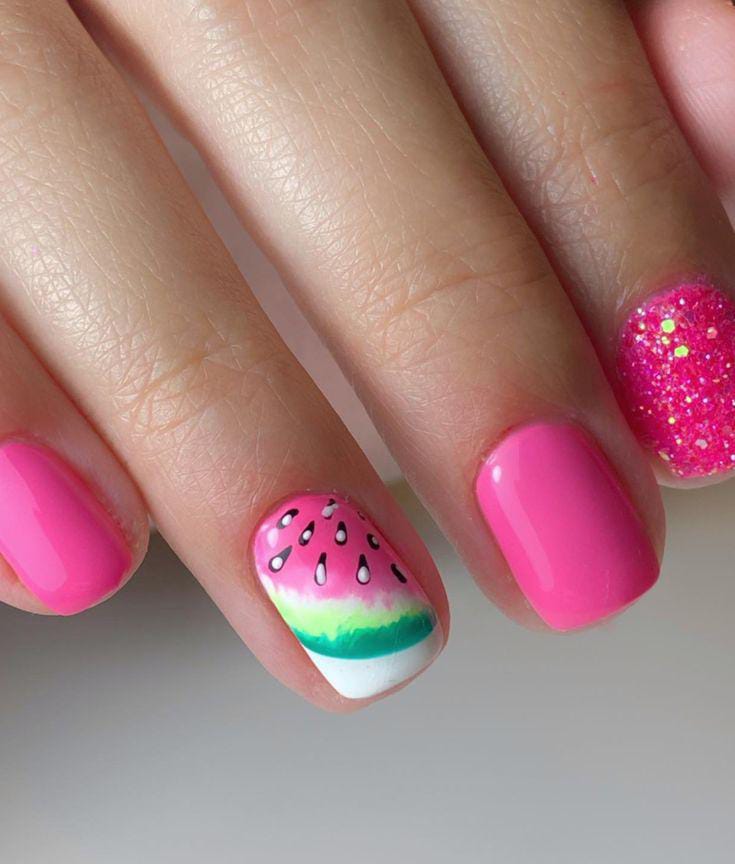 Bright pink nails are paired with a soft watermelon accent featuring gradient green and white tip tones. One glittery nail adds extra sparkle and summer glam. The overall vibe is sweet, cheerful, and full of fun vacation energy.