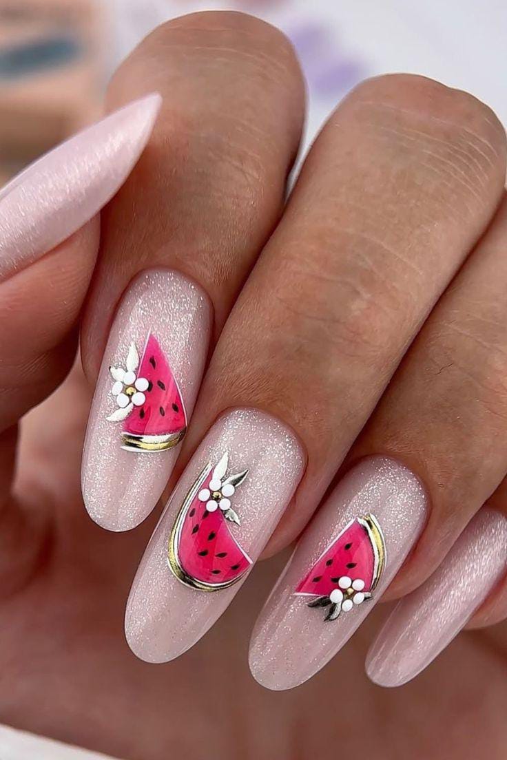 A soft pearly pink shimmer base gives this look a delicate glow, while bright watermelon slices stand out beautifully. The addition of small white floral, studs accents and subtle metallic line touches makes it feminine and slightly luxurious summer.