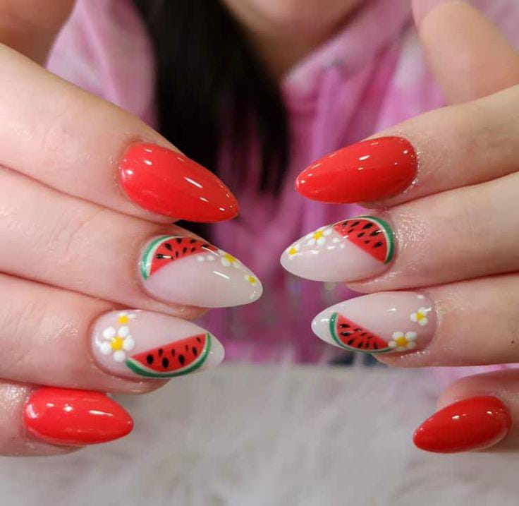 This design mixes glossy red nails with soft nude accents featuring watermelon slices and tiny white daisies dots. The bright red and green details create a cheerful, juicy summer vibe that feels fun and slightly floral.