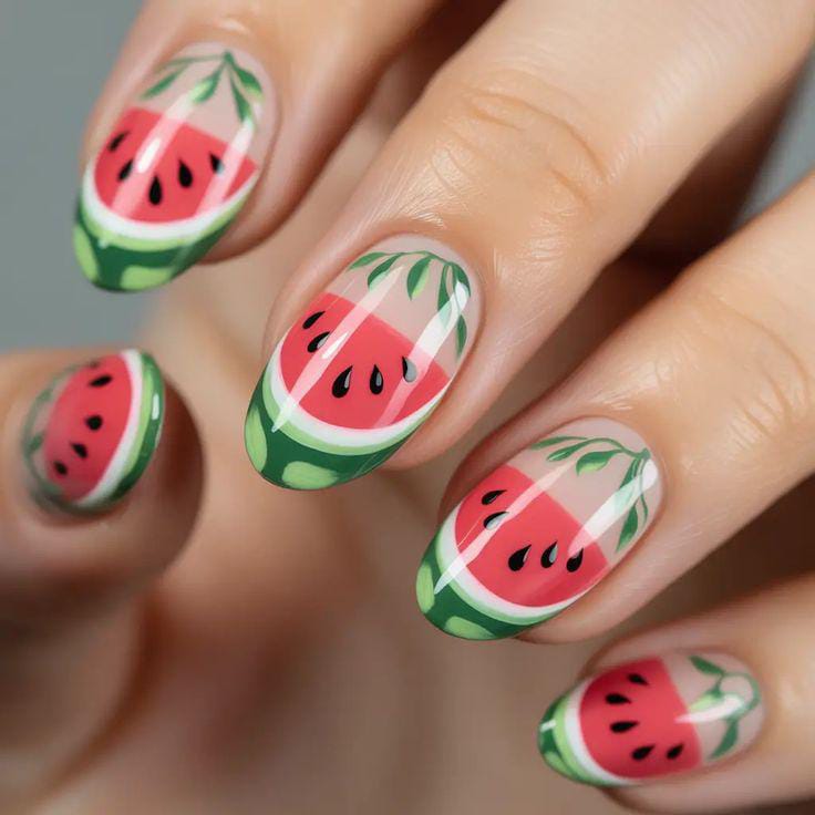 This set showcases detailed watermelon slices paired with green leaves on a nude base. The design feels artistic and slightly botanical, giving it a fresh, natural summer aesthetic. It’s playful but still elegant and refined.