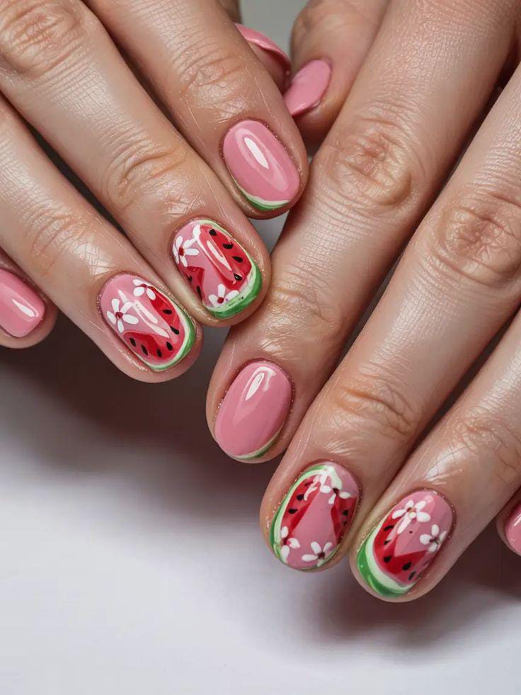 Soft pink nails are paired with detailed watermelon slices and delicate white floral accents. The combination feels feminine, sweet, and perfectly balanced between playful and elegant summer.