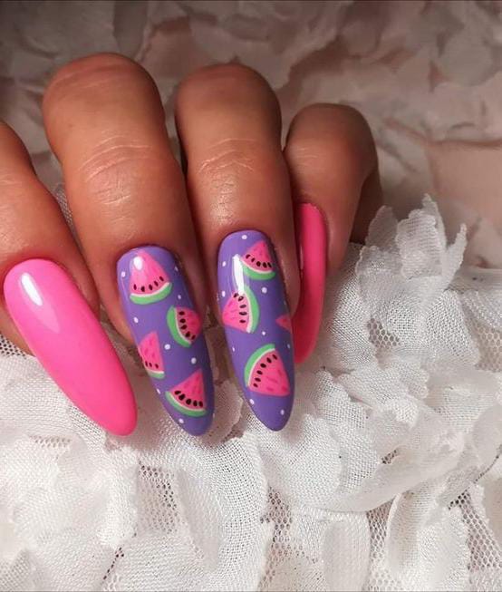 This set features vibrant pink nails alongside purple accent nails decorated with mini watermelon slices and tiny white dots. The contrast of purple and pink gives it a bold, trendy summer party vibe.