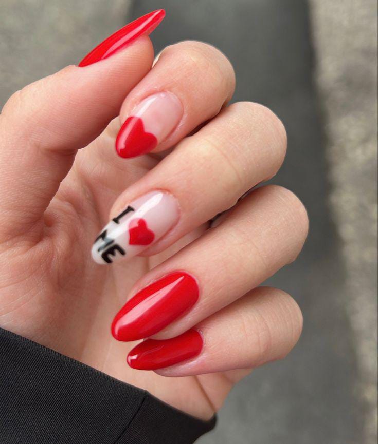 These glossy red almond nails are balanced with soft nude nails decorated with bold heart tips and a playful “I ❤️ Me” accent. The look feels fun, modern, and confident—perfect for a flirty Valentine vibe with a self-love twist.
