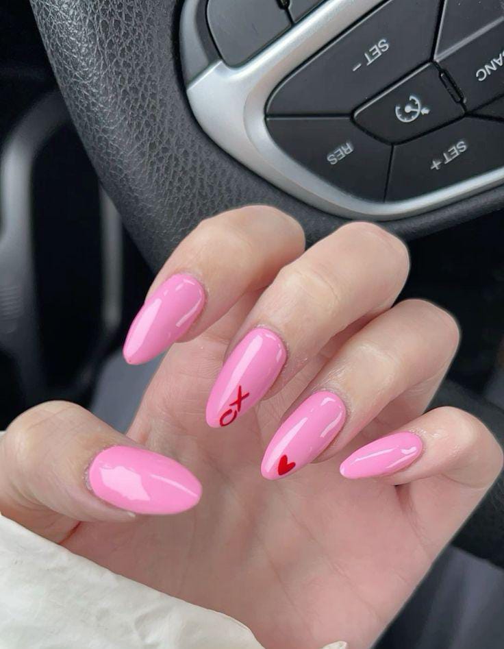 This design features glossy bubblegum-pink almond nails paired with tiny red accents like an “XO” and a mini heart, giving the whole look a cute, flirty Valentine vibe.