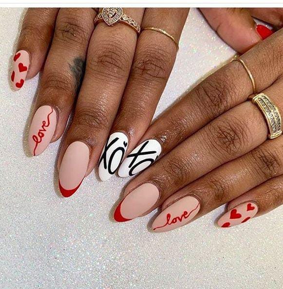 These nails blend nude tones with bold red details, including hearts, red tips, and handwritten-style words, creating a romantic Valentine’s look that feels modern and expressive.
