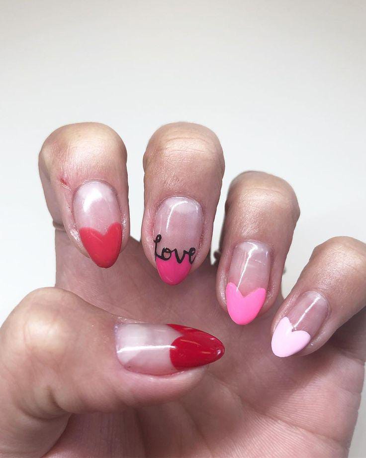 Set on a sheer base, each almond nail gets a soft pop of color through simple heart-shaped tips and a tiny “love” detail, giving a sweet, understated Valentine charm.