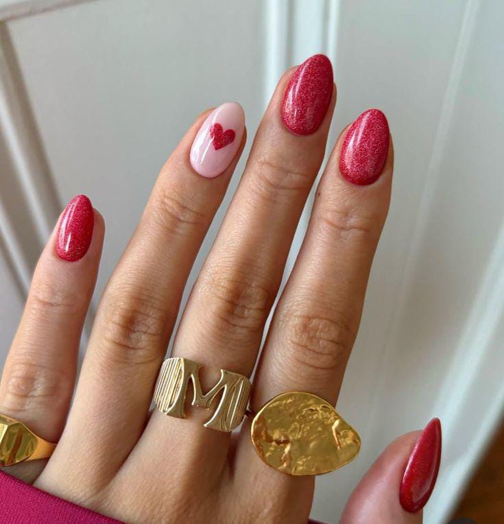 Glittery red almond nails contrast beautifully with a pale pink accent nail stamped with a single heart, creating a chic, cozy, Valentine-ready finish.