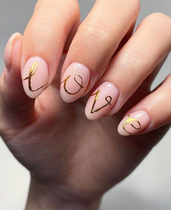 A clean nude base is paired with elegant gold lettering stretched across all nails, spelling out “love” in a delicate cursive flow. The look is minimal, refined, and effortlessly romantic Valentine.