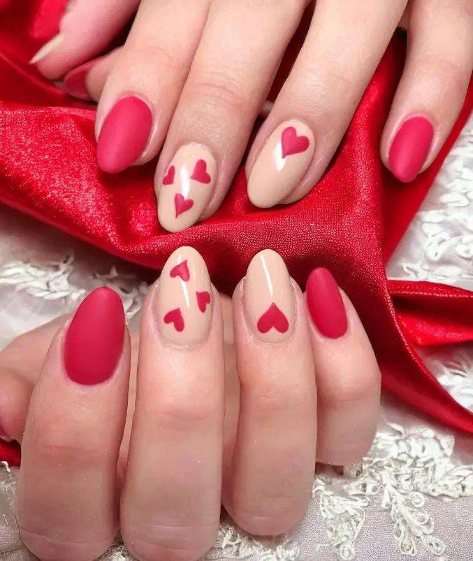 Matte red nails mix with nude nails decorated in simple red hearts, creating a bold yet soft Valentine contrast. The overall vibe is charming, balanced, and sweetly romantic.