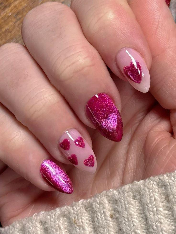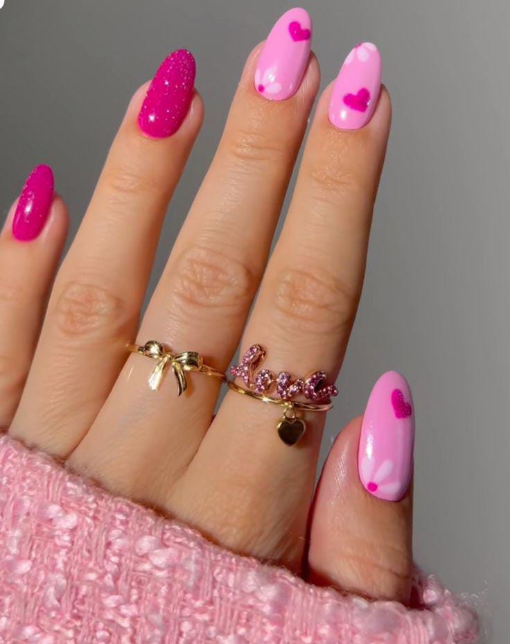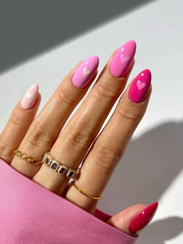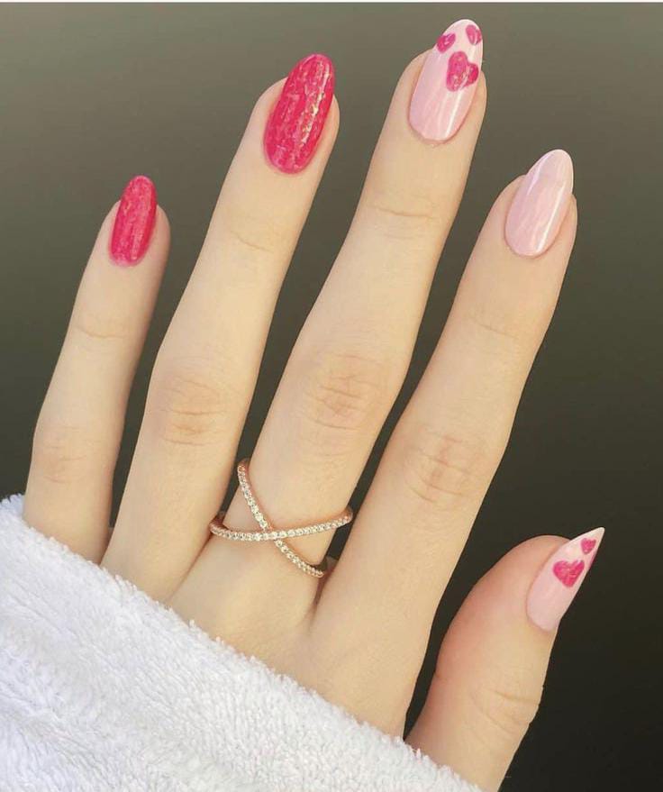 This design mixes bright and soft pink shades with tiny heart accents, giving the nails a fun, girly Valentine vibe. The glossy finish and subtle petal-like details keep the look playful yet sweet.