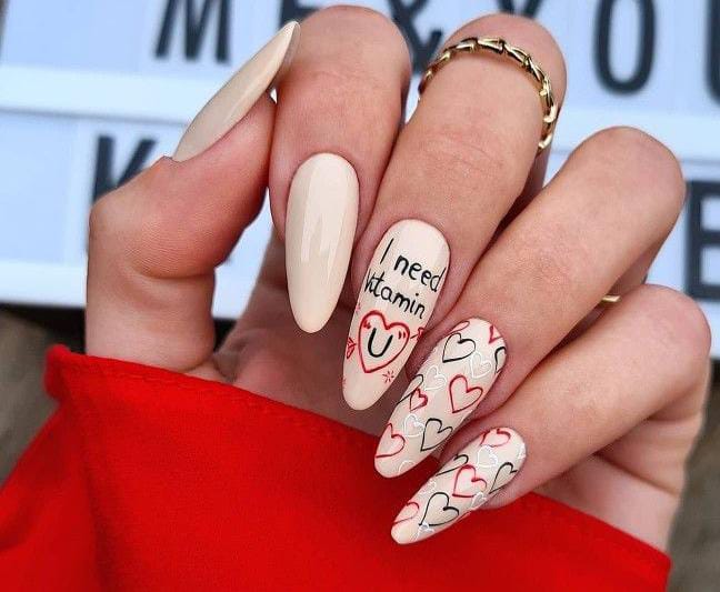 A soft nude base sets the tone for this cute, casual look featuring scattered heart outlines and a fun handwritten message. It feels romantic but relaxed, perfect for someone who loves a playful Valentine theme without going too bold.
