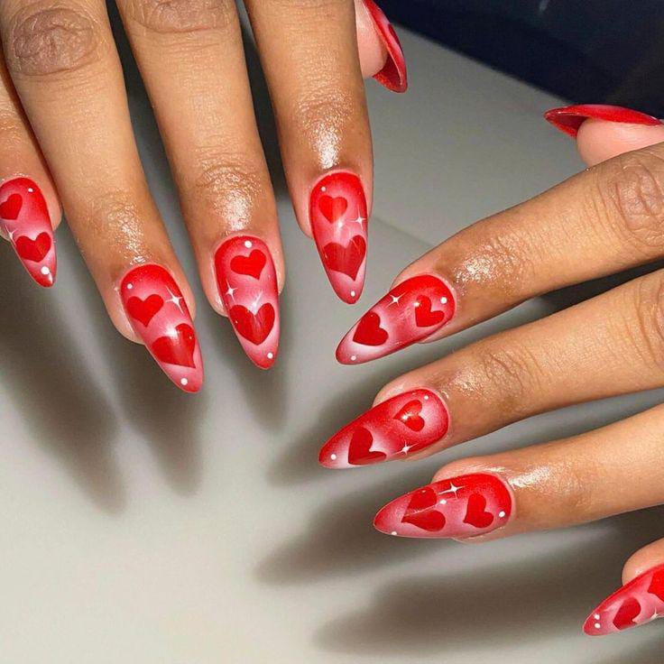 These bright red almond nails feature glowing heart patterns with a glossy, airbrushed finish, giving them a vibrant, eye-catching Valentine energy. The look is bold, fun, and full of romantic flair.