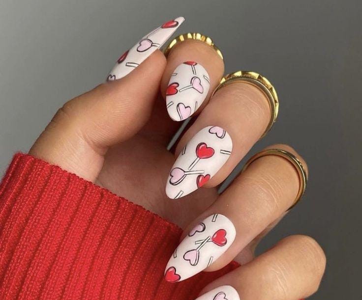 This design features a soft, milky base covered in red and pink hearts drawn like tiny lolly pop, giving the nails a cute and whimsical Valentine vibe.