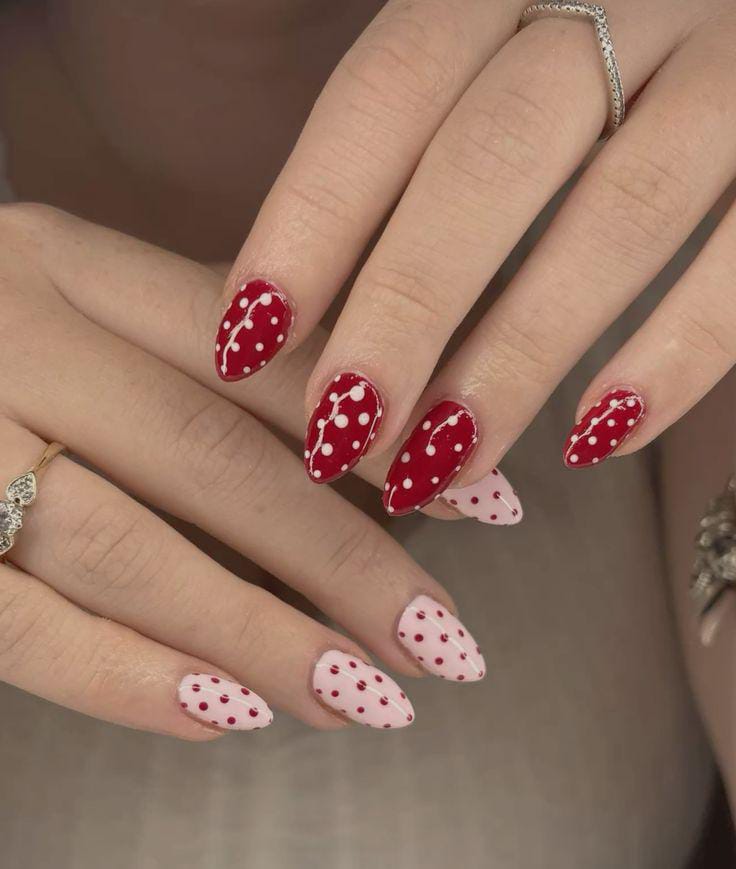 With alternating red and blush nails dotted in playful white and red polka patterns, this look feels charming, cozy, and perfect for a soft Valentine aesthetic.