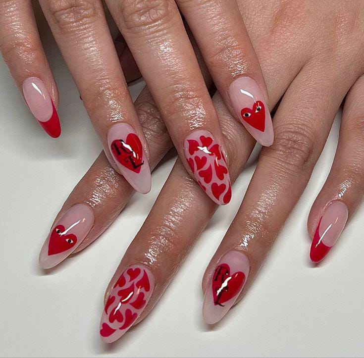 These almond nails mix glossy red accents and scattered heart motifs over a nude base, creating a bold yet romantic Valentine look. The combination of red French tips and expressive hearts gives the design a flirty, eye-catching edge.