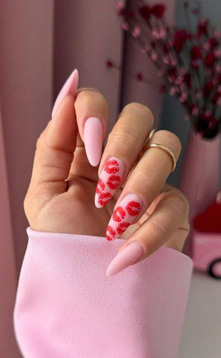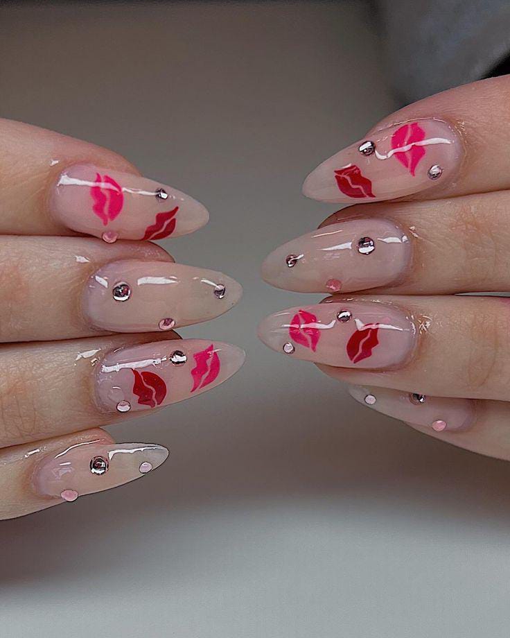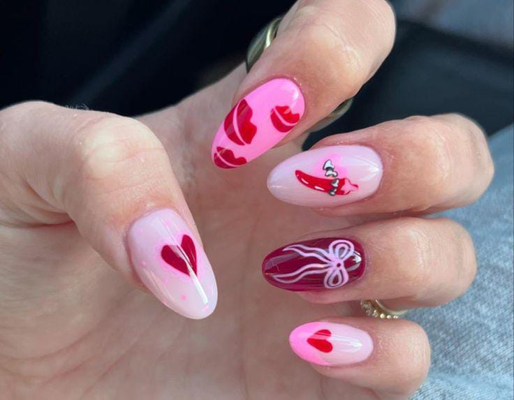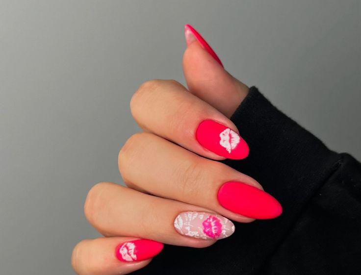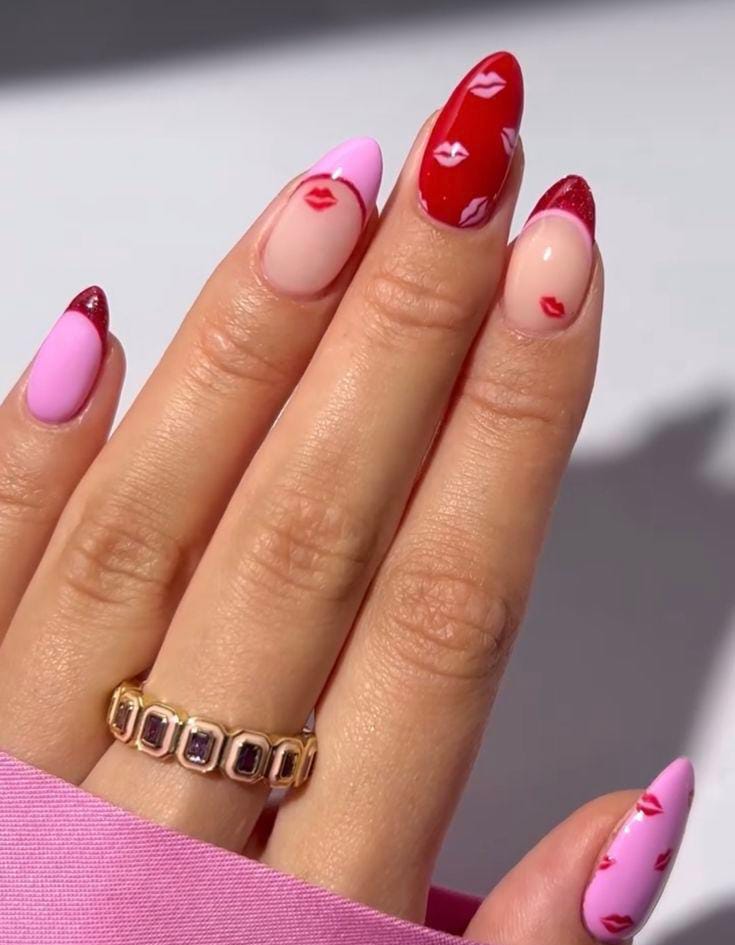 A mix of bright pinks, nudes, and deep reds paired with tiny lip prints creates a bold, flirty Valentine look. The high-contrast colors make the almond shape feel extra striking and chic.