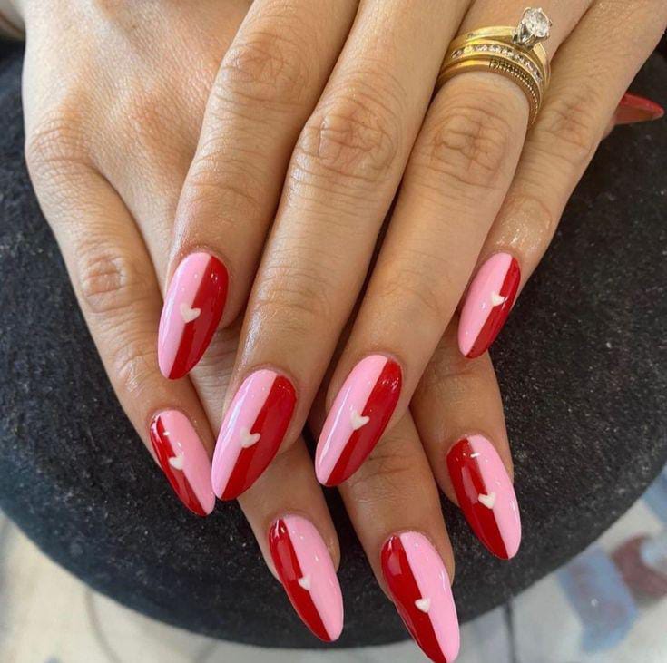 Featuring split red and pink nails with tiny white hearts, this design feels modern, clean, and effortlessly romantic. The crisp color blocking adds a chic twist while keeping the Valentine theme front and center.