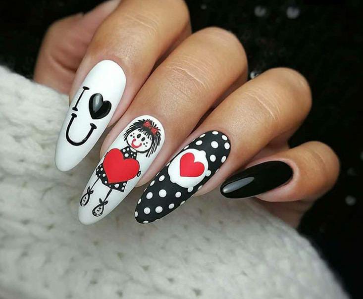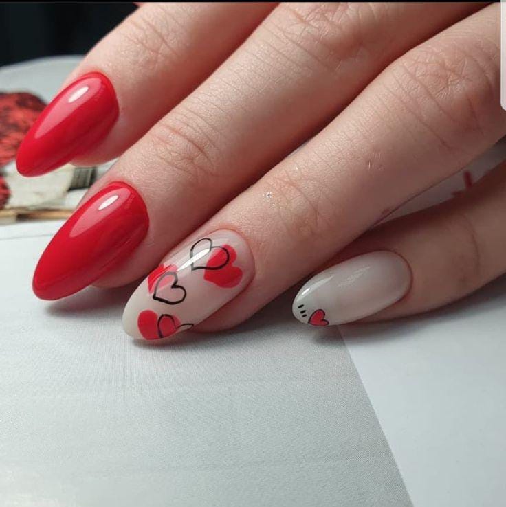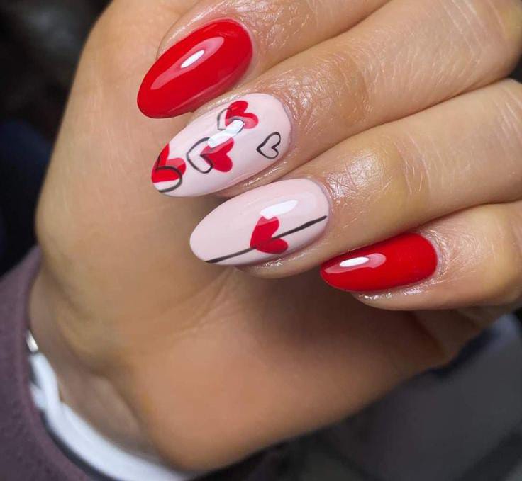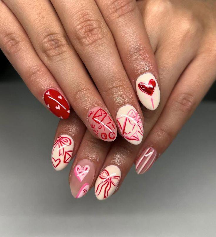 This design mixes soft cream and blush bases with playful red and pink line art, giving the nails a cute, hand-drawn Valentine’s love-note vibe. It feels fun, youthful, and full of sweet little romantic details without being overwhelming.