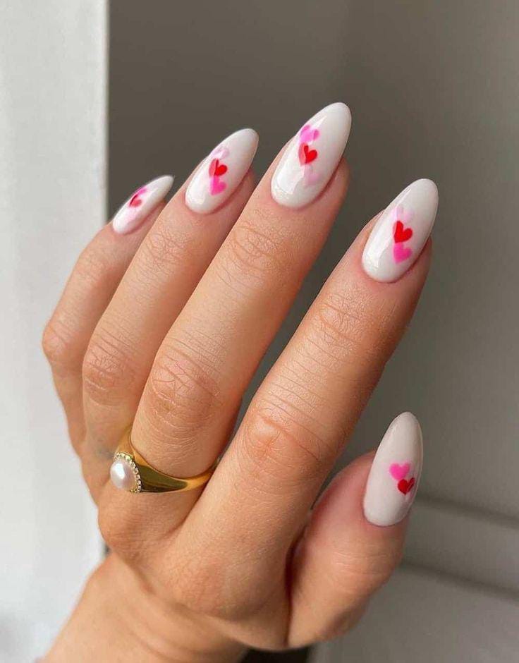 A soft white base sets the stage for tiny red and pink hearts that look like they’re gently drifting across the nails. The overall look is airy, simple, and sweet—perfect for a soft Valentine aesthetic.