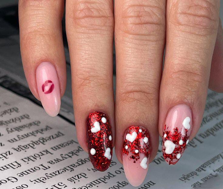 Bold red glitter nails are paired with soft pink tones and scattered hearts, creating a fun mix of sparkle and romance. The combination gives a cute, celebratory Valentine’s energy with lots of shine.