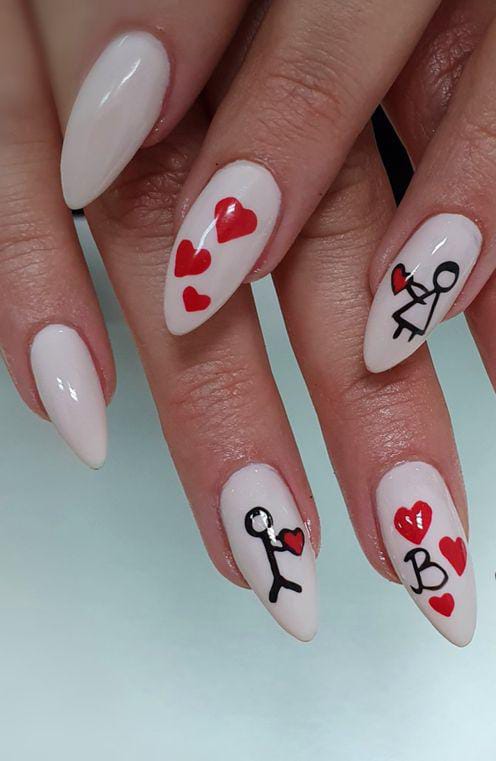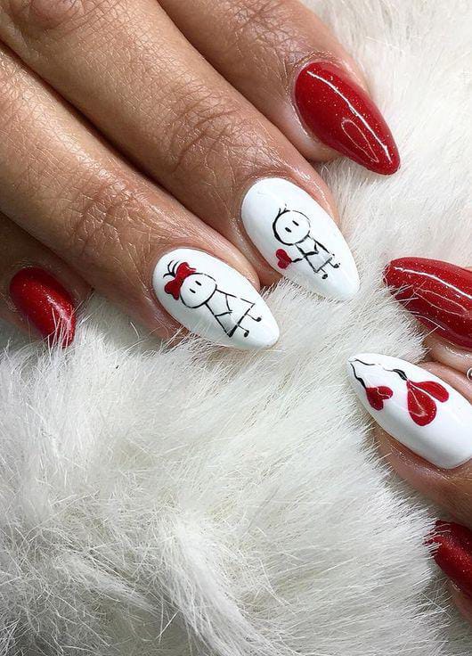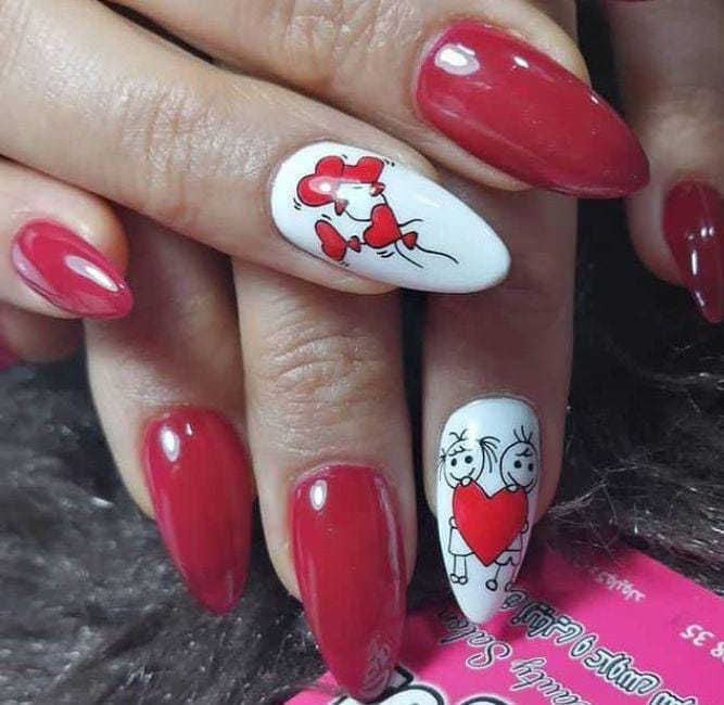 Bold red nails paired with simple white accent nails featuring adorable stick-figure characters create a charming, story-like Valentine look. The mix of bright color and minimal art makes the design both cute and eye-catching.