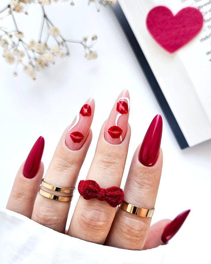 Deep red almond nails balance beautifully with clear-nude accent nails featuring glossy red lip stamps. The contrast feels bold and stylish while still keeping a romantic Valentine theme.