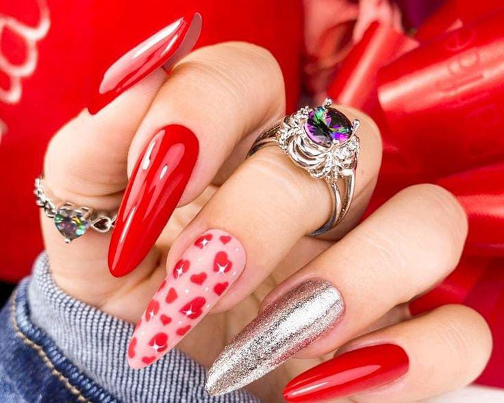 This set mixes bold red almonds with a soft pink accent nail covered in tiny hearts and a shimmering silver nail for extra glam. The overall look is vibrant, romantic, and perfect for a bold Valentine vibe.