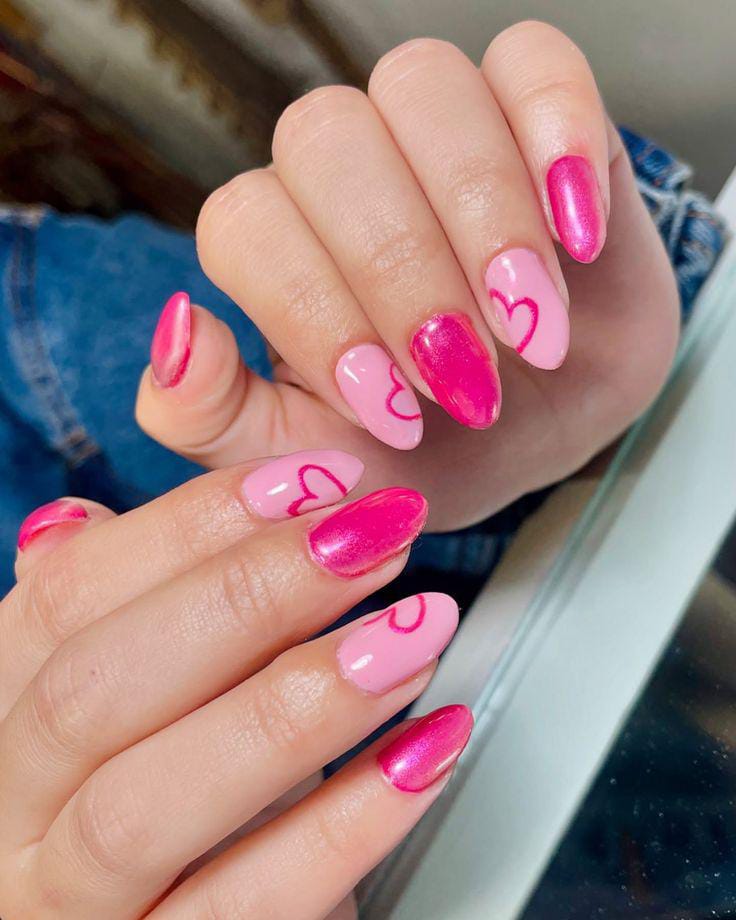 These almond nails blend soft pink with bright pink, finished with simple heart outlines that keep the look cute and flirty. The mix of shimmer and pastel gives it a sweet, feminine Valentine feel.