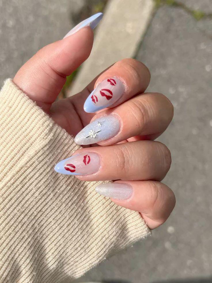 This look blends soft icy blue and sheer shimmer with bold red lip prints for a playful yet delicate Valentine vibe. The mix of cool tones and flirty accents gives it a subtle but fun romantic feel.