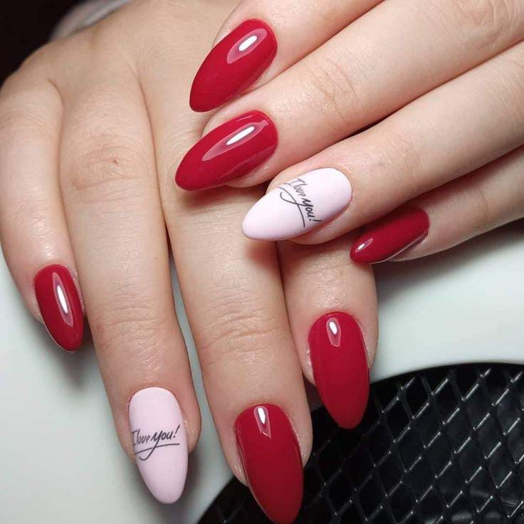 This design pairs deep, glossy red nails with soft pink accent nails that showcase subtle love-note lettering. It’s simple, elegant, and timeless—perfect for a polished Valentine look.
