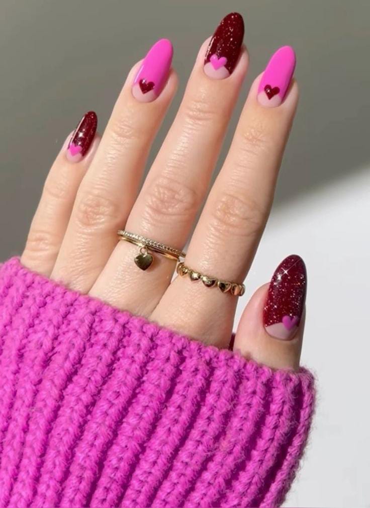 Light pastel pinks paired with deep berry accents and tiny heart motifs create a romantic contrast. The mix of soft and dark tones gives the look a cozy yet elegant Valentine feel.