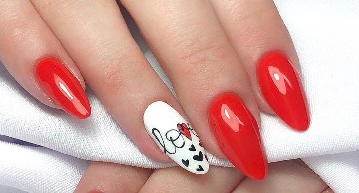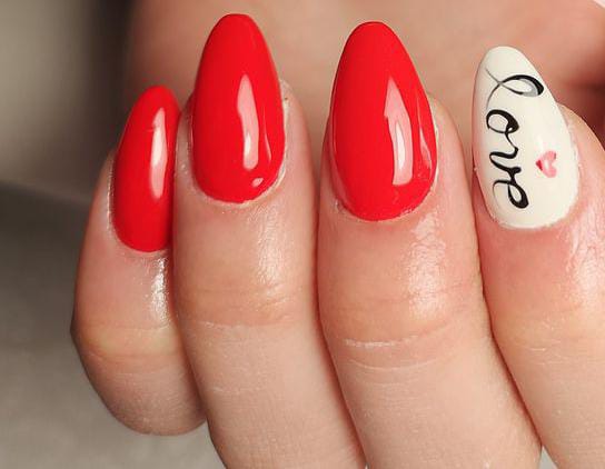 Glossy red almond nails are paired with a single white accent nail featuring a hand-written “love” design, blending classic Valentine color with a simple, charming touch.