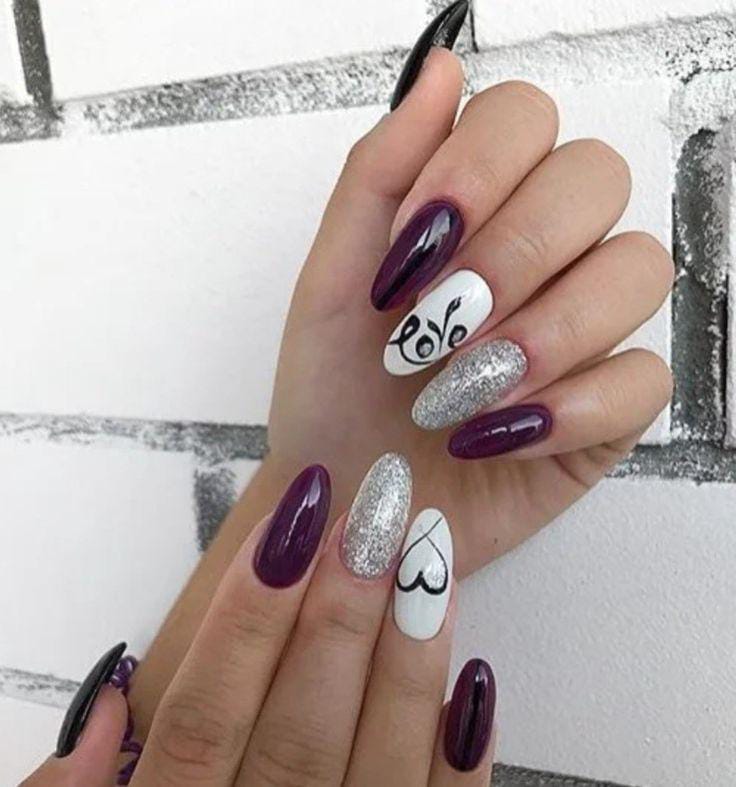This almond set mixes deep plum polish with sparkling silver accents and clean white nails that feature simple love-themed line art, giving the whole look a bold yet romantic Valentine’s feel.